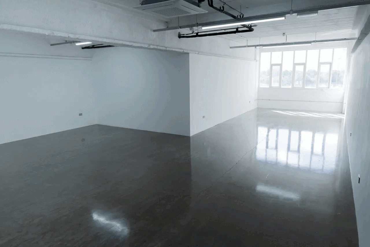 Empty, bright modern office space with large windows, reflective polished concrete floors, white walls, exposed ceiling with lighting fixtures, and electrical outlets on the walls.