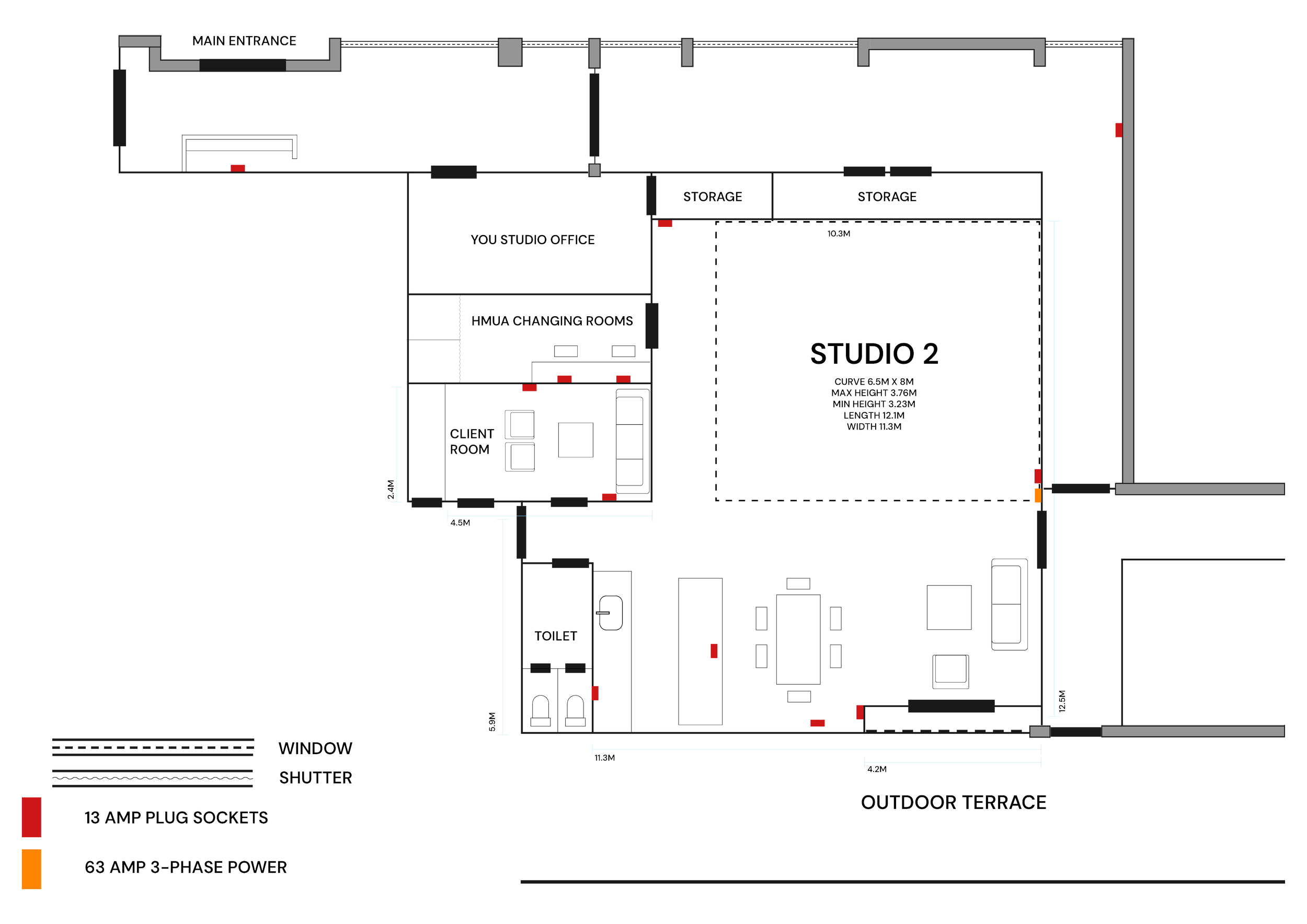 AT YOU STUDIO LONDON, STUDIO 2 IS A FLEXIBLE LONDON PHOTOGRAPHY STUDIO DESIGNED FOR SEAMLESS PRODUCTION AND PREMIUM CLIENT COMFORT. SPANNING 1,798 SQFT, IT FEATURES A 6.5M DEEP × 8M WIDE COVE, REACHING A MAXIMUM HEIGHT OF 3.79M. FOR LARGER PRODUCTIONS, STUDIO 2 CAN BE COMBINED WITH STUDIO 1, CREATING A VAST 4,204 SQFT FLOOR SPACE.